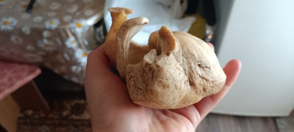 This impressive whale eardrum, or tympanic bulla, measures approximately 11.5 to 12 cm in length and represents a rare opportunity to acquire a beautifully preserved anatomical structure from one of the ocean’s most remarkable creatures.